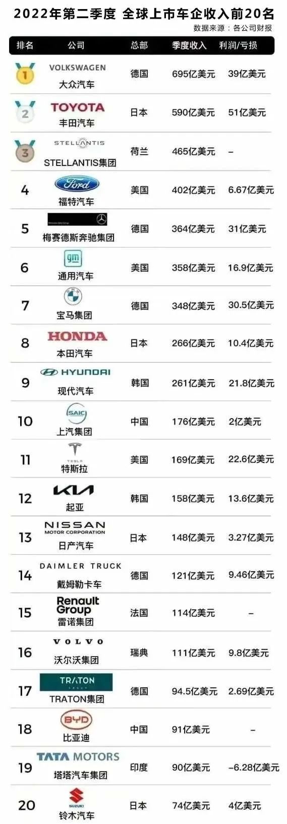 接下來,咱們就圍繞著下列這張表格,也就是今年第二季度全球上市車企收入前20強(qiáng),來給大家簡單地分析一下。