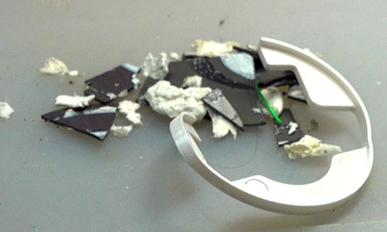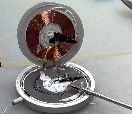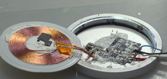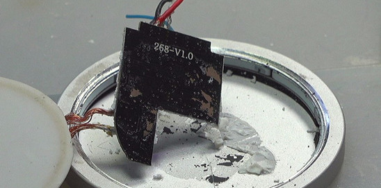 使用一字改錐撬開(kāi)白色的表面外殼,顯露出其背后的充電線圈。在充電線圈與下面結(jié)構(gòu)之間存在著一個(gè)很薄的鐵氧體薄片,在撬開(kāi)線圈塑料殼的時(shí)候它已經(jīng)破裂。