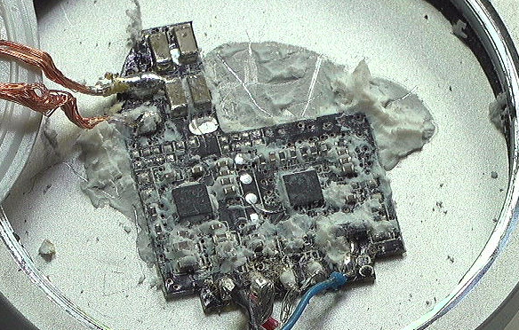 將破損的鐵氧體薄片清理,下面是由白色乳膠封固的電路板。四周還有一圈白色塑料的永磁鐵擋片。此貼塑料擋片是把四周均勻分布的永磁鐵封固在充電器金屬外殼中。