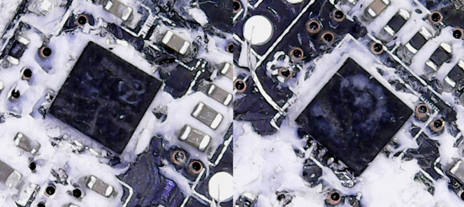 電路板上的兩顆QFN封裝的芯片,表面的文字信息看不太清楚。