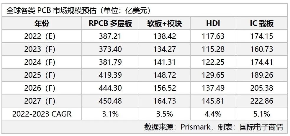 根據(jù)研調(diào)機(jī)構(gòu)Prismark預(yù)估,2023年全球PCB產(chǎn)值為783.67億美元,較2022年817.41億美元下滑4.13%,但2024年起將恢復(fù)逐年成長(zhǎng),2023年~2027年年均復(fù)合成長(zhǎng)率為3.8%。至于產(chǎn)品線類別,2023年P(guān)CB產(chǎn)業(yè)包括RPCB多層板、軟板+模塊、HDI、IC載板,這四大產(chǎn)品線產(chǎn)值將全線衰退。其中:RPCB多層板產(chǎn)值排第一,達(dá)373.4億美元,較2022年衰退3.57%;IC載板產(chǎn)值達(dá)160.73億美元,較2022年衰退達(dá)7.71%,衰退幅度最大;軟板+模塊產(chǎn)值達(dá)134.27億美元,較上年衰退3%;HDI產(chǎn)值達(dá)115.28億美元,較上年衰退2%。