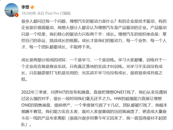 汽車雷達線路板廠了解到,理想汽車CEO李想國內社交平臺發文稱,2022年三季度,問界M7的發布和操盤,直接把理想ONE打殘了,我們從來沒遇到過這么強的對手,很長一段時間我們毫無還手之力。HW的超強能力直接讓理想ONE的銷售崩盤、提前停產,一個季度就虧損了十幾億,團隊都被打殘了,我根本就睡不著覺,我們能力實在太差,面對人家很基礎的出招就崩潰了,更造成大量奮斗在一線的產品專家離職(很高興很多同事今年又回來了,我一直覺得很對不起團隊)。