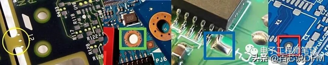 從左到右:郵票孔 - 安裝孔 - 防焊焊盤- 基準標記