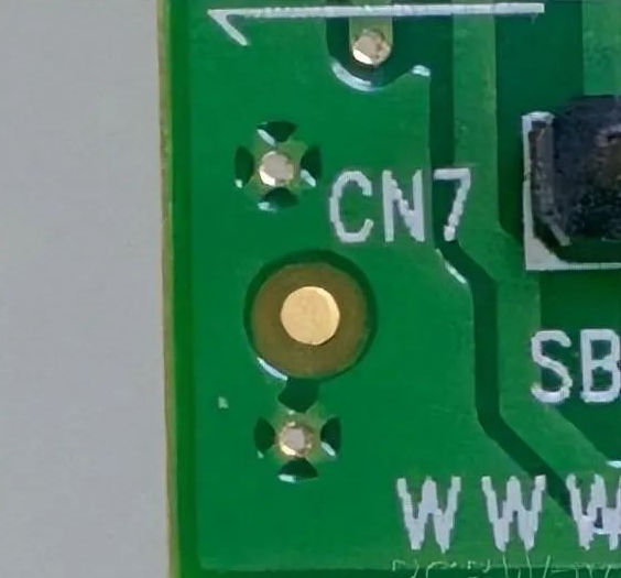 一個更大的裸圓圈內有一個裸銅圓圈。該基準標記用作拾放 (PnP) 機器的參考點。基準標記位于三個位置: