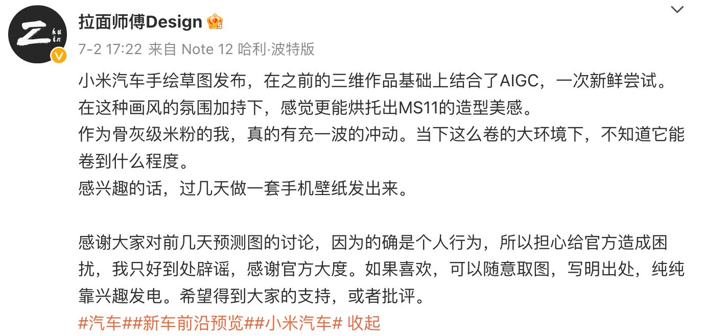 這其實是骨灰級米粉@拉面師傅Design 綜合最新的爆料、各方針對小米汽車外觀的透露信息整理設計出來的。