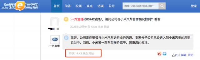 值得一提的是,根據(jù)@Techweb的報道,長春一汽富維汽車零部件股份有限公司在互動平臺透露:
