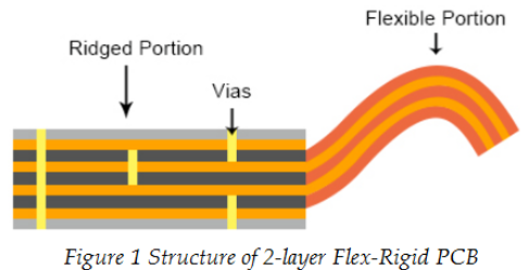 柔性剛性PCB的柔性部分采用柔性PI銅箔材料制成,屬于多柔性PCB類。多柔性PCB屬于一種傳統的柔性剛性PCB,已經使用了三十多年。多柔性PCB具有由剛性基板材料和柔性基板材料層疊的混合結構,并且通過電鍍通孔實現電導體之間的互連,所述電鍍通孔將穿過剛性和柔性材料。下面的圖1展示了雙層柔性電路板的結構。