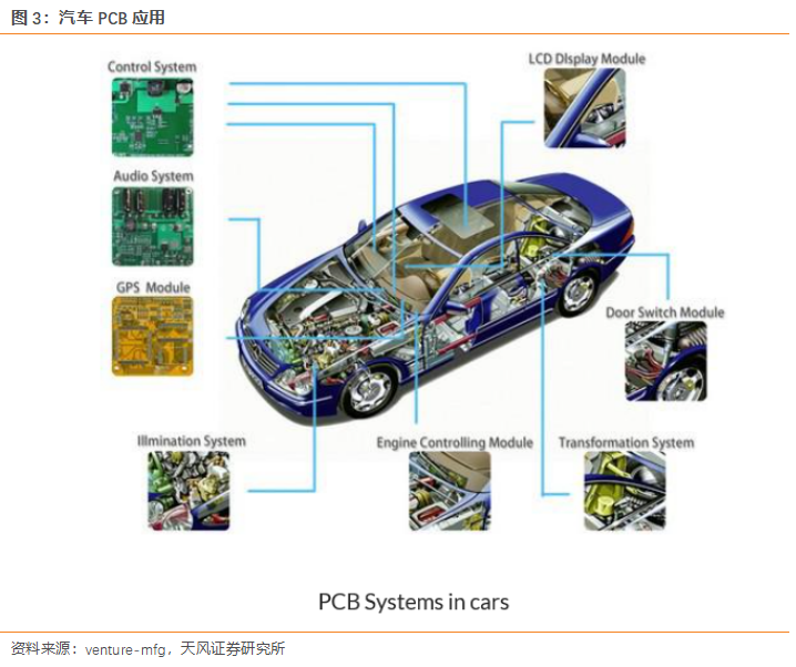 PCB廠講汽車多部件應用PCB。在汽車整車中,目前多個領域均有PCB的應用,包括控制系統、影音系統、GPS模塊等等,應用場景豐富。我們認為,未來汽車電子化程度不斷提升,汽車PCB應用需求仍將繼續增加,車用PCB發展態勢良好。