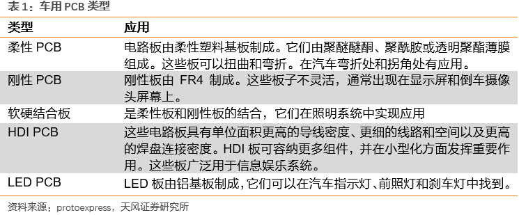 按照類型分,汽車PCB主要類型包含5類,分別是柔性PCB板即FPC、剛性PCB板即RPCB、軟硬結合板、HDI板以及LED PCB。由于材質與特性的不同,各類型PCB擁有不同的應用場景。