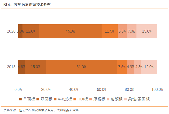 新四化下,汽車電子整車占比持續提升,汽車電子應用中PCB為重要底座支撐,提升汽車PCB的應用需求。