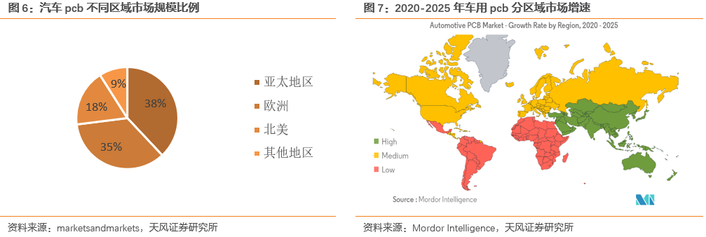 亞太地區是規模最大市場,同時是增長最快的市場。分區域來看,亞太地區車用PCB市場規模位列全球首位,占據全球38%的市場份額,同時根據Mordor Intelligence的預測,未來亞太地區市場將成為增速最高的市場。其中我們認為,中國市場也將成為快速增長,充滿機遇的市場。
