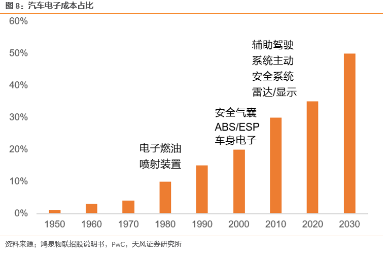 新能源汽車新趨勢帶動汽車電子占比進一步快速提升。新能源車汽車電子占比更高。汽車電子在整車成本中的占比不盡相同,其中在緊湊型乘用車成本中的占比達到 15%,中高端乘用車占比達 28%,混合動力乘用車占比達 47%,純電動乘用車占比達 65%。