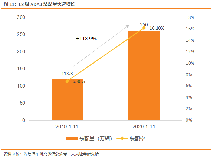 電路板廠了解到,ADAS滲透率持續提升,未來預計裝配量仍將持續增長。根據佐思汽研的數據,2020年1-11月份配備L2級自動駕駛功能的乘用車上險量260.0萬輛,同比增長118.9%;裝配率16.1%,比上年同期增加9.3個百分點。盡管受多重負面影響,L2裝配量實現逆勢上漲,市場表現出需求強勁。