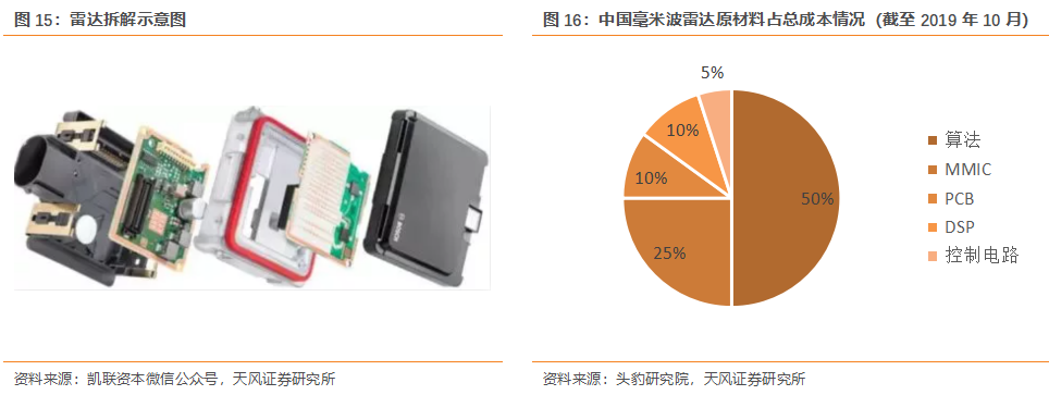 毫米波雷達基于PCB構成。毫米波雷達的構成中包括控制電路、DSP、算法、PCB等,PCB為其中的基礎支撐,對于毫米波雷達的性能具有重要的影響。根據頭豹研究院數據,截至2019年10月,中國毫米波雷達成本構成中,PCB占約10%的比例。