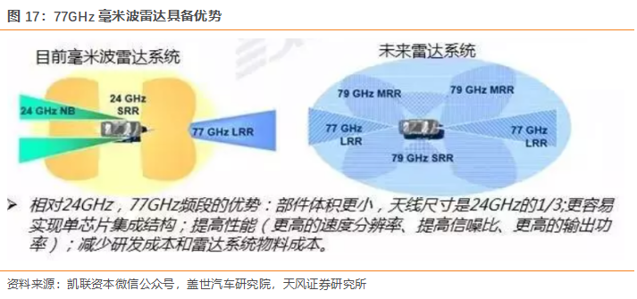 77GHz毫米波雷達成為主流,對比24GHz擁有顯著優勢。目前各國對于毫米波雷達分配頻段不同,主要集中在24GHz和77GHz,少數國家(如日本)采用60GHz頻段。對比24GHz的毫米波雷達,77GHz雷達在體積尺寸、速度分辨率、信噪比等指標上擁有明顯的優勢。2018年12月,77GHz毫米波雷達的單月出貨量已超過24GHz毫米波雷達,我們預計未來77GHz毫米波雷達應用將逐漸增多。