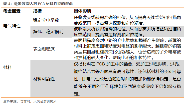 77GHz毫米波雷達對于PCB要求提升,帶動PCB價值量提升。在毫米波雷達中PCB對其性能具備一定影響,所以對于PCB的性能要求隨之提升。包括材料的電氣特性、材料的可靠性方面需要有嚴格的考量,以提高天線增益和掃描角度或范圍,滿足雷達探測和定位精度以及保證在不同的工作環境如不同溫度或濕度下仍能保持穩定。