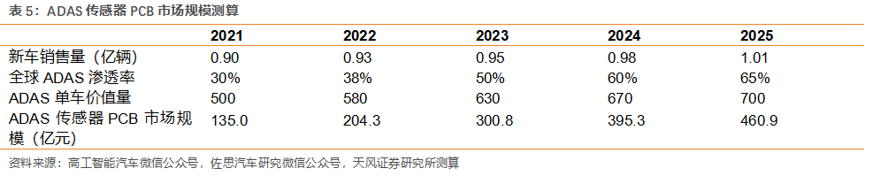 ADAS傳感器PCB單車價值量:根據佐思汽研數據,特斯拉Model 3的ADAS傳感器PCB價值量在536-1364元之間,假設2021年平均單車ADAS傳感器PCB價值量為500元,此后不斷增長,至2025年達到700元。