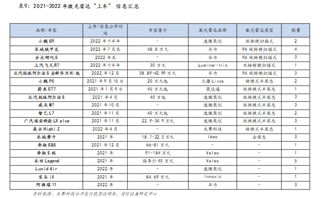 (2)裝配激光雷達的幾款代表性車型:2022 年開始,蔚來 ET7、小鵬 G9、沃爾沃XC90 等使用激光雷達的車型將逐步交付。但受限于高階自動駕駛滲透率提升不及預(yù)期(激光雷達成本昂貴,一般在L3級以上的高階自動駕駛才會配備),激光雷達上車進程 2022 年表現(xiàn)一般。