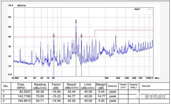 將晶振內移,使其離PCB邊緣至少1cm以上的距離,并在PCB表層離晶振1cm的范圍內敷銅,同時把表層的銅通過過孔與PCB地平面相連。經過修改后的測試結果頻譜圖如下,從圖可以看出,輻射發射有了明顯改善。