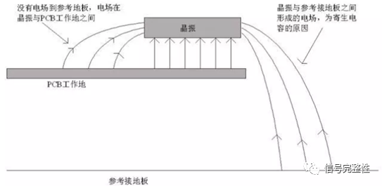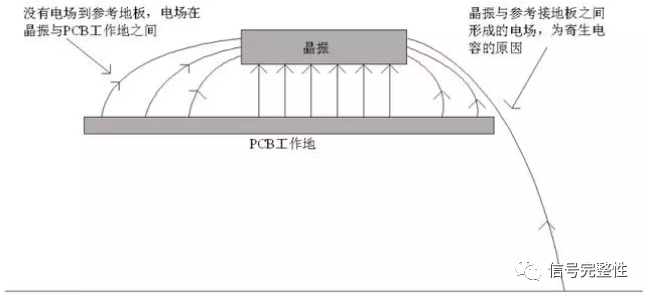 圖3:PCB邊緣的晶振與參考接地板之間的電場分布示意圖