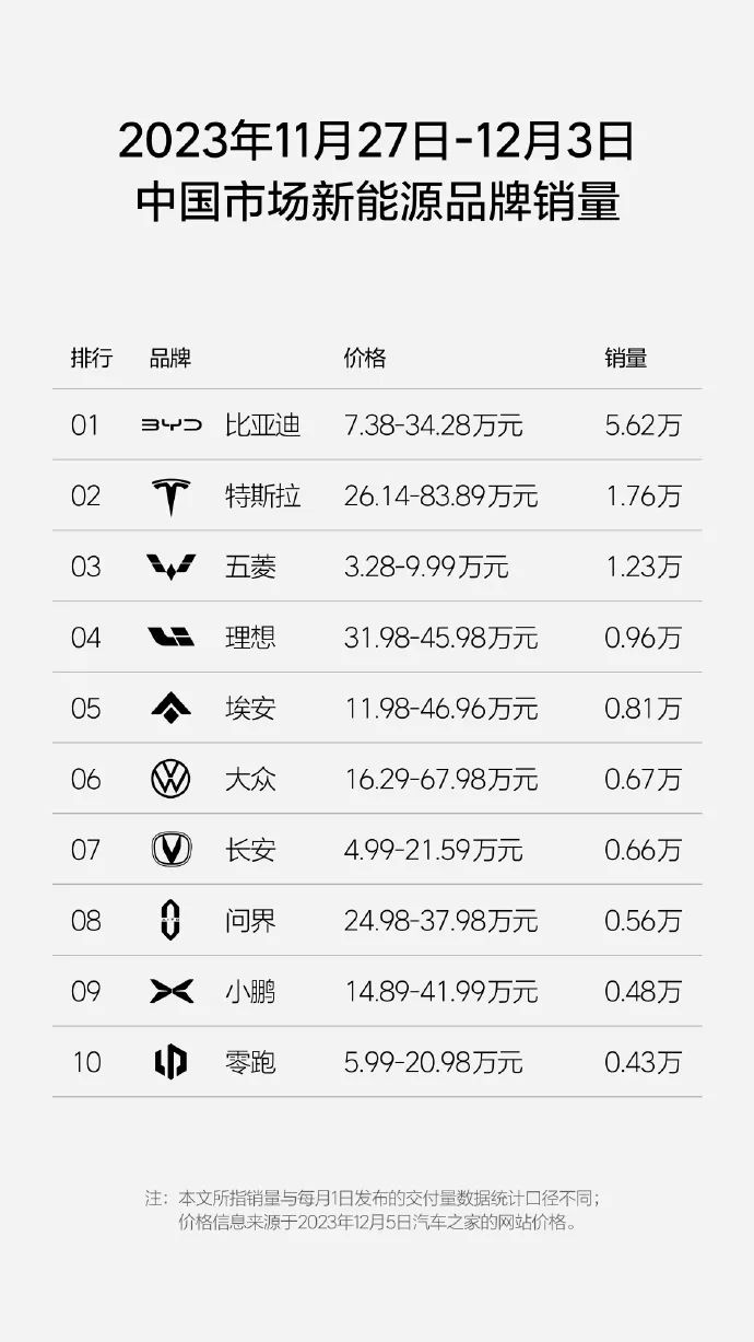汽車軟硬結合板廠了解到,11月27日至12月3日最新一周最新一周新能源汽車品牌銷量出爐。從榜單排名來看,周銷量前三車企分別為比亞迪、特斯拉和五菱。其中,比亞迪以5.62萬輛的周銷量繼續蟬聯榜首,特斯拉和五菱周銷量則分別為1.76萬輛和1.23萬輛。