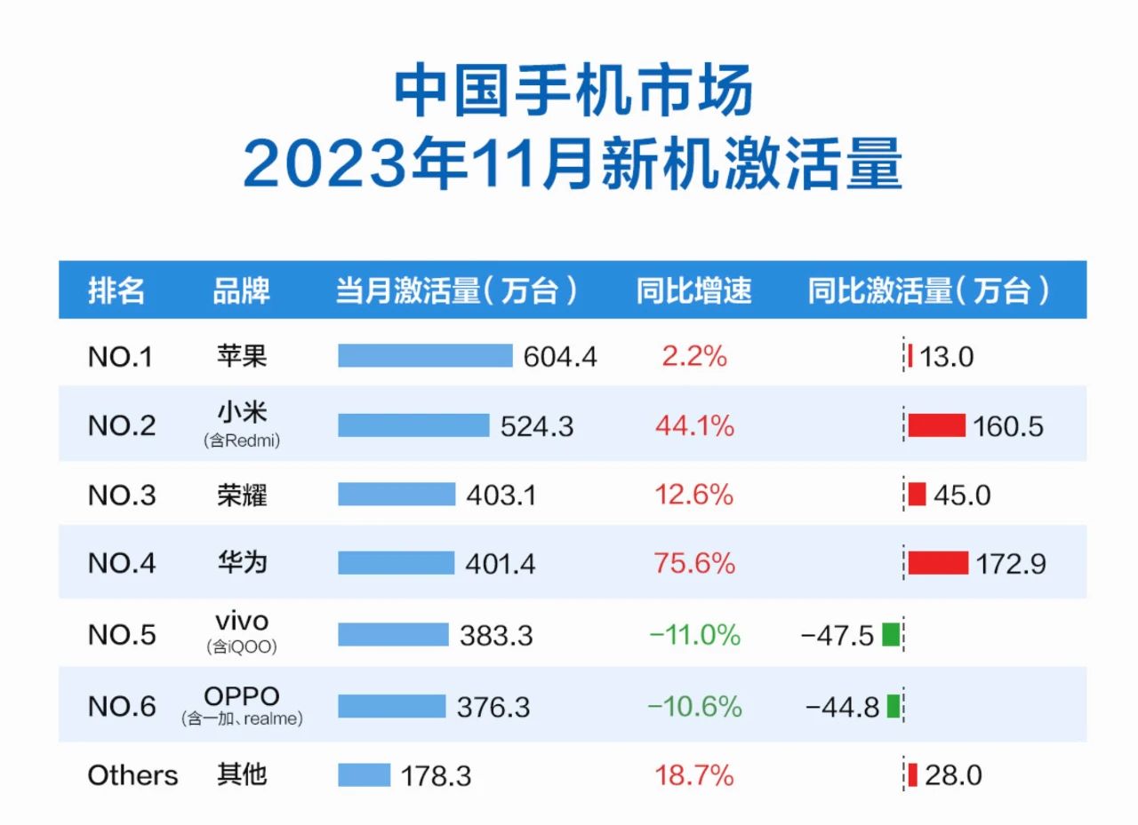 華為憑借爆火的“遙遙領先”Mate60系列持續且穩定的出貨量,在新發布機型缺貨的情況下,還讓它11月份的新機激活量達到了401.4萬臺,同比增長了75.6%。