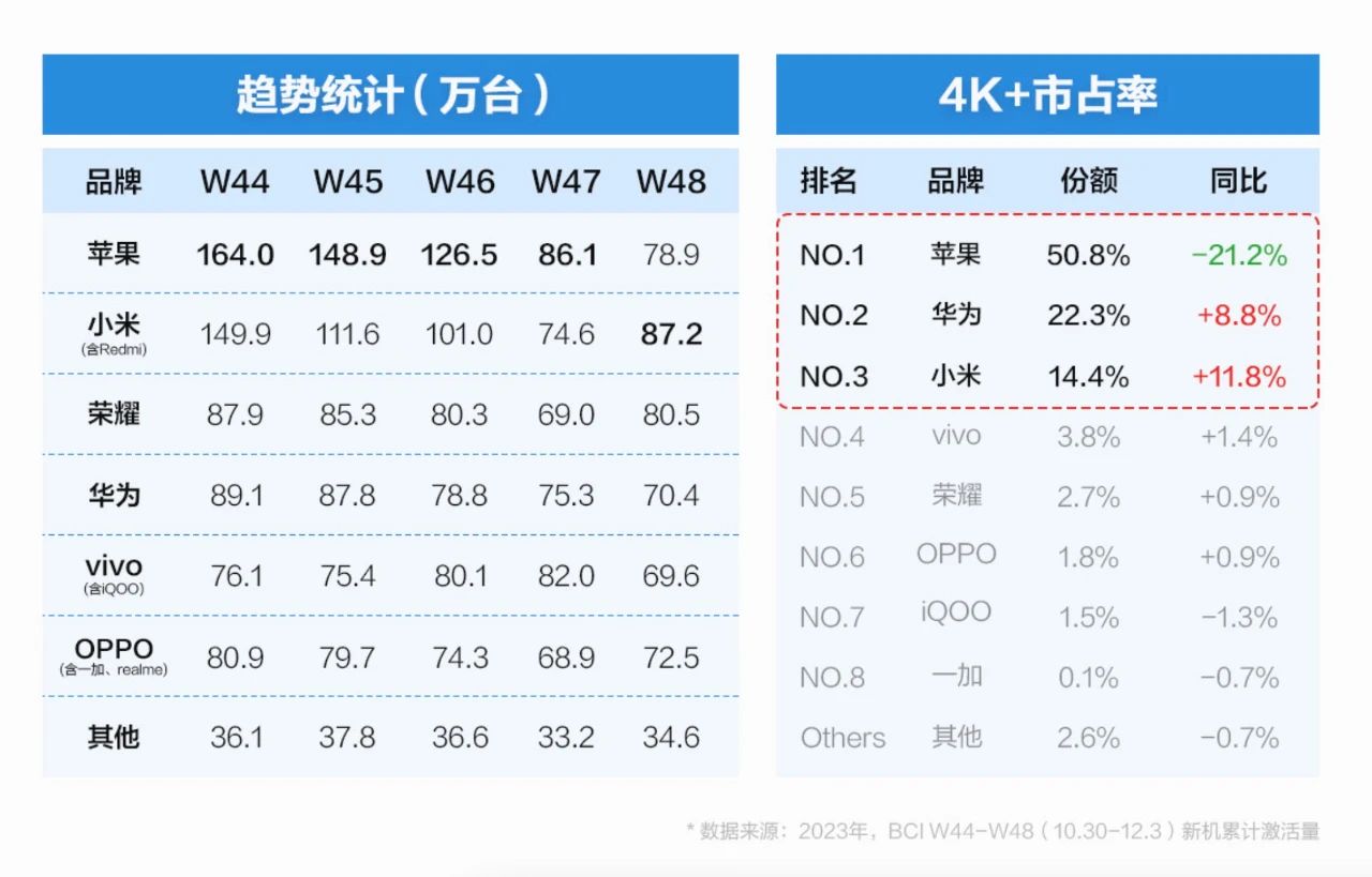 華為和小米在4K+的份額都有明顯上漲,華為同比增漲了8.8%,小米也同比增漲了11.8%。