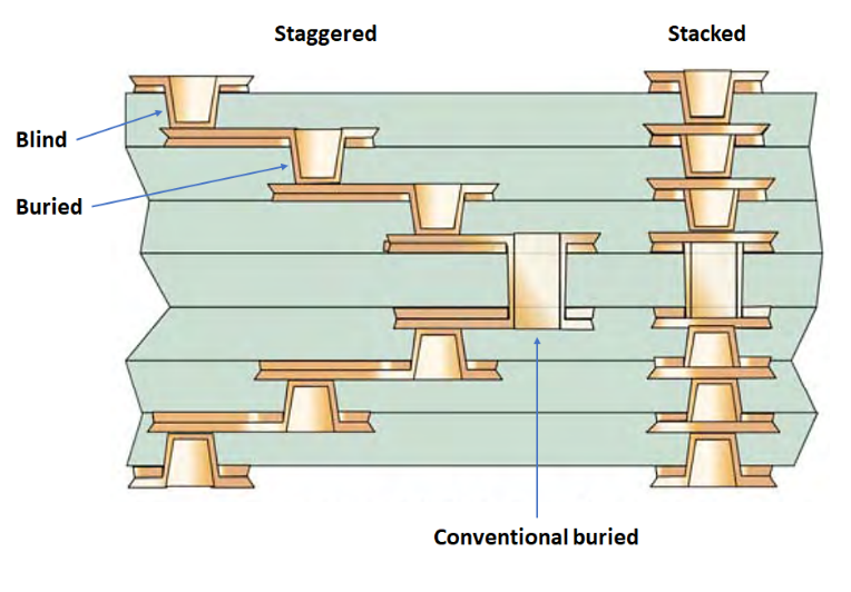 HDI板采用不同類型的微孔,包括錯位和疊加微孔。錯位微孔連接相鄰層,而疊加微孔連接非相鄰層,提供更高的路由密度。