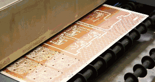 感光機用UV燈對銅箔上的感光膜進行照射,透光的膠片下,感光膜被固化,不透光的膠片下還是沒有固化的感光膜。固化感光膜底下覆蓋的銅箔就是需要的PCB布局線路,相當于手工PCB的激光打印機墨的作用。