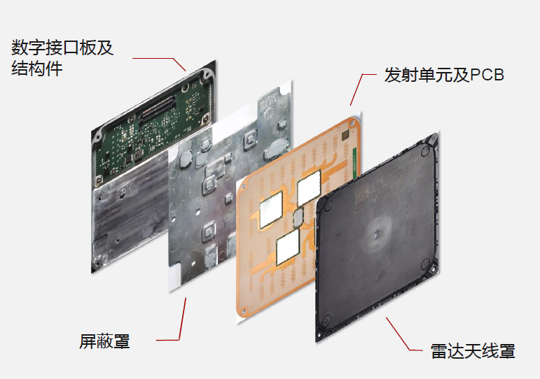 采埃孚4D毫米波雷達(dá)應(yīng)用在國內(nèi)某中高端純電平臺(tái)上,單車搭載2個(gè)雷達(dá),分別安裝在前后保險(xiǎn)杠內(nèi)部,可以實(shí)現(xiàn)最遠(yuǎn)探測距離350米。從拆解的信息來看,該4D雷達(dá)可以分為4個(gè)部分,分別是數(shù)字接口板及結(jié)構(gòu)件、發(fā)射單元及PCB、屏蔽罩和雷達(dá)天線罩,如下圖所示。