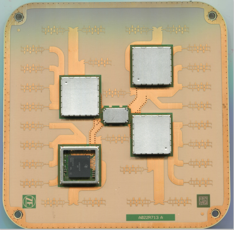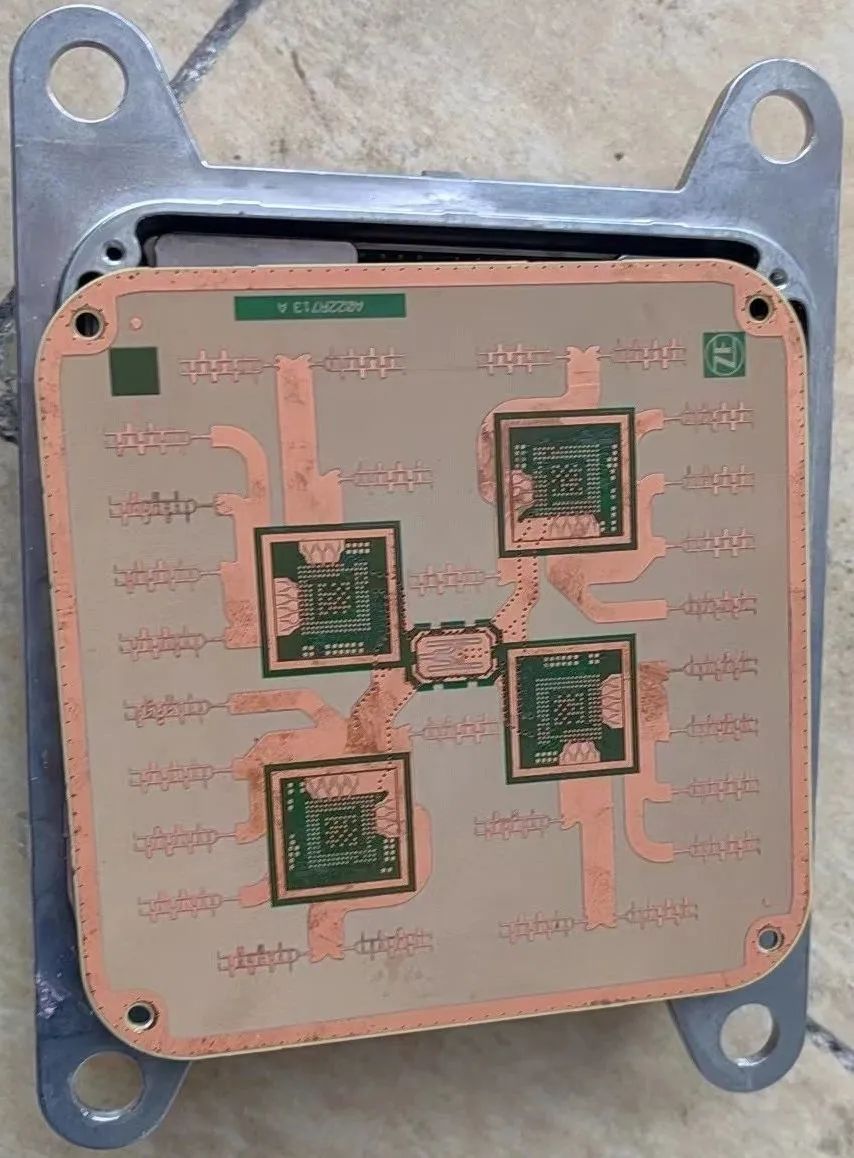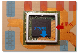 移除屏蔽罩后,可以清晰地看見內(nèi)部黑色的MMIC,以及3發(fā)4收的電路特征,如下圖所示。MMIC具體型號(hào)為AWR2243P,由德州儀器提供。