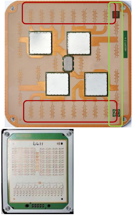 從雷達(dá)天線排列位置的角度,也能辨別4D 毫米波雷達(dá)與傳統(tǒng)毫米波雷達(dá)的區(qū)別。下圖中上面部分為本次拆解的采埃孚4D毫米波雷達(dá),感興趣的朋友可以自行研究這個(gè)天線布局(稀疏均勻陣+Monopulse布局)。下面部分為來自日本電裝的傳統(tǒng)3D毫米波雷達(dá)。