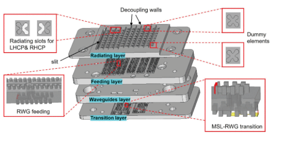本文提出的天線系統基于一種新型的圓極化(CP)槽元件,該元件既充當輻射器又充當極化器。該設計高度緊湊,孔徑尺寸為0.44λ? × 0.44λ?,厚度為0.64λ?。系統包含四個發射通道和三個接收通道,實現了發射端和接收端的全CP結構,并分為四層:輻射層、饋電層、波導層和過渡層。在互耦合(MC)方面,設計采用了去耦墻和虛擬元件,實現了高端口隔離度(≥35 dB)。該天線系統特別設計為具有寬軸比(AR)視場(FoV),這對于有效的雷達目標檢測至關重要。測量結果表明,在接收端方位平面±60°和發射端±50°范圍內,嵌入式AR均小于等于3 dB,表現出卓越的性能。