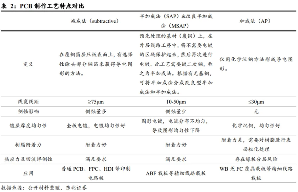 減成法(subtractive):減成法是在原材料覆銅箔基材上,通過鉆孔、孔金屬化、圖形轉移、電鍍、蝕刻或雕刻等工藝加工,選擇性地去除部分銅箔,形成導電圖形。缺點是會使裸露的銅箔層在往下蝕刻過程中可能產生該線路側蝕問題,導致制作小于50μm的線寬/線距良率過低問題,但該工藝應用于普通PCB、FPC與HDI等電路板產品綽綽有余;