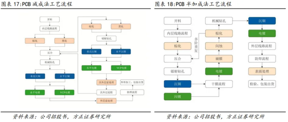 電路板主要的制作工藝分為三類,分別是減成法、半加成法、加成法,適用于不同類型的產品。同時在同一款基板的制作中也可依據需求使用上述三類工藝的混合工藝。目前PCB生產工藝中減成法和半加成法為主流: