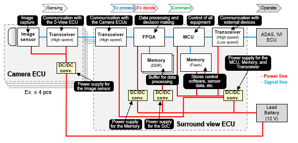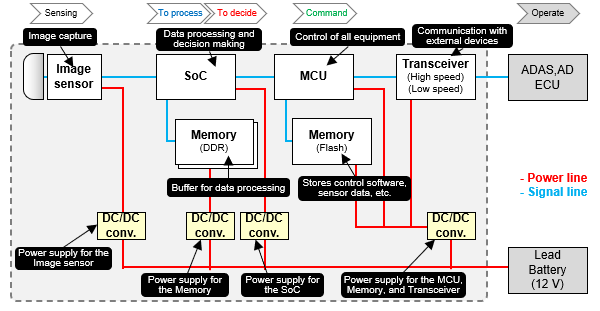 圖像傳感器通過攝像頭鏡頭捕捉畫面并轉(zhuǎn)換為電信號。然后通過高速數(shù)據(jù)傳輸通道,將圖像數(shù)據(jù)傳輸SoC進行處理,SoC處理之后的結(jié)果再通過域控MCU向外部ECU發(fā)出指令。