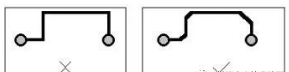 為降低EMI,應(yīng)避免走線、過孔及其它元器件形成90°角,因?yàn)橹苯菚?huì)產(chǎn)生輻射。在該角處電容會(huì)增加,特性阻抗也會(huì)發(fā)生變化,導(dǎo)致反射,繼而引起EMI。要避免90°角,走線應(yīng)至少以兩個(gè)45°角布線到拐角處。