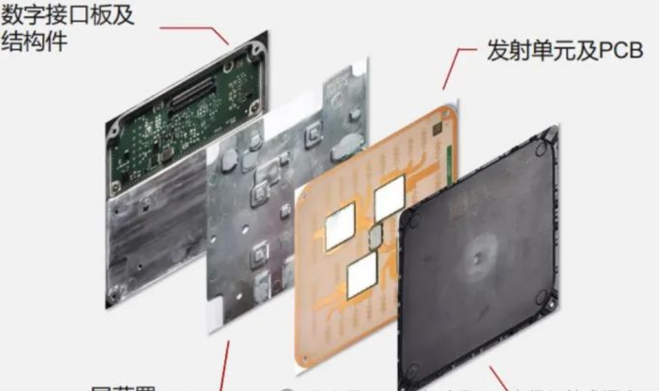 下面我們就以最新的4D毫米波雷達為例,了解毫米波雷達PCB如何起到信號收發的功能。如下圖示,毫米波雷達主要由以下四部分組成,分別是數字接口板及結構件、射頻天線PCB、屏蔽罩和雷達天線罩。
