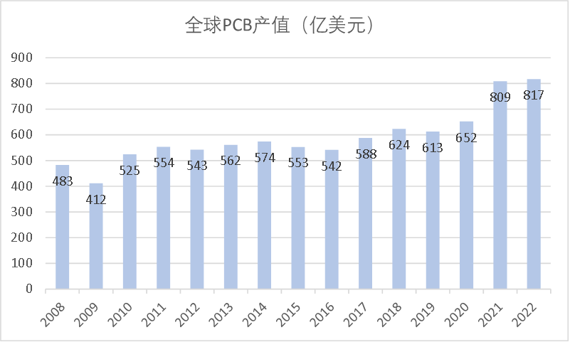 電路板行業的市場規模,跟隨數字經濟發展,歷年來都是持續增長的態勢,期間穿插著周期波動。根據行業內最權威統計機構Prismark的數據,全球PCB市場規模在2022年達到了817億美元,過去的復合增速在3.8%左右。按照這個速度,預計到2027年,全球的PCB市場規模將有望首次突破1000億美元。
