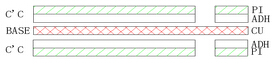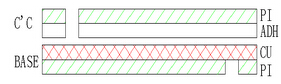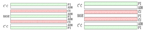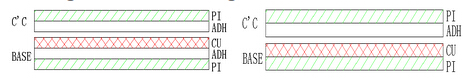 ⑵上下保護膜開口不在同一區域時的做法:CU+CC(無膠基材+保護膜)。此時CC的膠只能用環氧膠,不可用壓克力膠;是走蝕刻PI線。