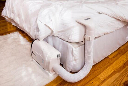 它的主機(jī)部分類似空氣壓縮機(jī),可以生成冷風(fēng)和暖風(fēng),通過該一個(gè)管道送入被窩,用戶需要將管道固定在床角。同時(shí)它的管道送風(fēng)口采用了扁平設(shè)計(jì),可以很好地固定在床角。不過主機(jī)尺寸較大,也比較沉重,你需要把它放置在床尾地面上,可能需要留意下床時(shí)不要撞到它。