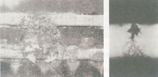 只要有水解性的離子污染物存在(例如:從助焊劑殘留或高分子釋出的鹵素及酸),這種現象就會明顯的加速。爆板剝離或空泡,這也會提升濕氣或污染物的累積,可能提升樹狀結構的成長,導電性陽極細絲成長是一個特別的樹狀結構成長案例,后面會做一些討論。故障發生的時間反比于間距平方及電壓,這方面的故障機構在加速測試中已經檢討過了。