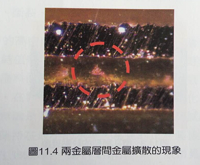 另一個HDI電路板較重要的信賴度缺點,就是銅金屬離子遷移的問題。由于電路板的接點密度提高以及連通孔徑的縮小,因此相對的導通金屬距離相對拉近,絕緣層也輕薄化了。這樣的問題所帶來的信賴度困擾是,在兩相鄰金屬間很容易產生金屬的離子遷移,尤其是在信賴度測試中提高濕度時會加速離子遷移的速度。圖11.4所示,為HDI電路板經過信賴度測試后發生金屬擴散現象的狀態。