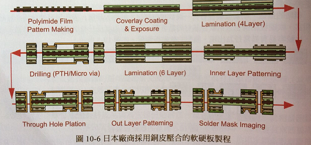 到了這個階段材料會進(jìn)行預(yù)機械加工、堆疊等處理,除些之外軟硬結(jié)合板生產(chǎn)大致上會與電路板及軟板生產(chǎn)類似。實際上多數(shù)軟硬結(jié)合板原材料如:蝕刻層等,都是電路板與軟板制造的產(chǎn)出物。從這個地方開始,軟硬結(jié)合板制程的特別作法才開始發(fā)生,此時我們也才面對特定軟硬結(jié)合板制作技巧。雖然軟硬結(jié)合板的基本制作概念相近,但是不同結(jié)構(gòu)與表面狀況的軟硬結(jié)合板還是會有一些制程順序與半成本結(jié)構(gòu)的差異。圖10-6所示,為日本某電路板廠商的軟硬結(jié)合板制程圖示。從資料中就可以看到,制程是采用表免銅皮覆蓋的結(jié)構(gòu)進(jìn)行制作,但是這種流程必然有其執(zhí)行的難處。因為銅皮的強度相對比較差,只要在制程中的操作讓它產(chǎn)生破裂,內(nèi)藏藥水的問題就會讓濕制程中的各種槽體相互污染,如果真的會發(fā)生這種問題,則這個制程的可行性就會受到質(zhì)疑。不過如果是采用比較厚的銅皮支撐,同時采用內(nèi)部填充的結(jié)構(gòu)操作風(fēng)險相對會降低,但是這種作法對于制作細(xì)線路的能力就會打折扣。