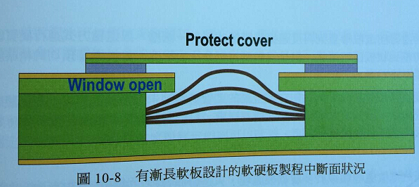 軟硬結合板的堆疊接合制程相當困難需要許多步驟,其中在PTH制程前需要進行密封作業的設計應該是最差的案例。采用漸長軟板結構問題是比較小的,在蓋板底下應該可以壓縮其增加的軟板長度,這樣可以避免額外的制程問題。典型應對漸長軟板的堆疊方式,是將蓋板切割出局部槽形窗讓比較長的彎折軟板層可以穿過來釋放壓縮。從蓋板處暴露的軟板面與復雜內部暴露區域,必須要被密封以避免無電析鍍、帶藥水污染等問題。密封漸層軟硬結合板的方法,要看需要處理的數量范圍而定,可以用相當依賴技巧的手動貼膠到各種暫時性成形膠膜密封等方式進行,這些處理會讓軟硬結合板凸起,在完成后都必須要去除。這樣產品的制程中典型斷面狀況,如圖10-8所示。