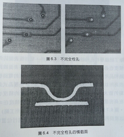 圖6.2是額外栓孔的照片。產(chǎn)生額外栓孔的主要原因是因?yàn)楦泄庑詷?shù)脂在使用時(shí)其中混有雜質(zhì)或氣體而在涂布的過(guò)程中于感光性樹(shù)脂的薄膜中產(chǎn)生氣泡,在后續(xù)制程中由于氣泡破了而產(chǎn)生孔洞。如照片右側(cè)的孔洞是由氣泡所形成的開(kāi)孔。