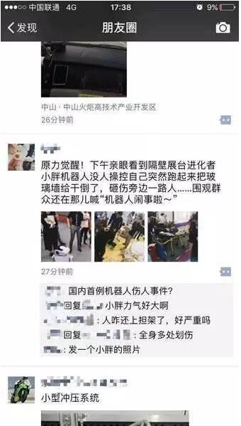 11月18日下午,深圳高交會官方回應此事稱,此次機器人傷人事件系工作人員操作不當撞倒玻璃所致。11月17日下午13時50分左右,第十八屆高交會1號館1D32展位深圳展景世紀科技有限公司展臺發生意外事件。由于該展商工作人員操作不當,誤將“前進鍵”當成“后退鍵”,導致用于輔助展示投影技術的一臺機器人(又名“小胖”,北京進化者機器人科技有限公司生產)撞向展臺玻璃,玻璃倒地摔碎并劃傷一名現場觀眾,致其腳踝被劃破流血。