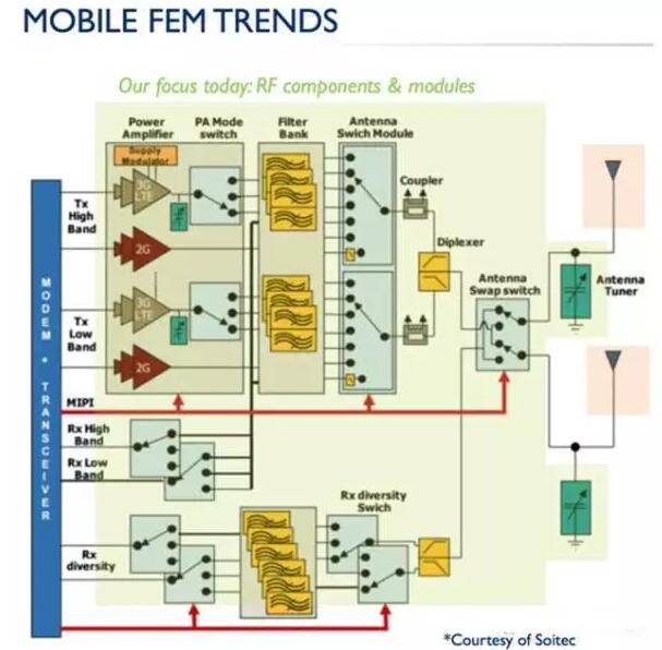 射頻器件是無線通訊設備的基礎性零部件,隨著CMOS射頻集成電路的普及,越來越多的模塊從分立器件轉到了集成電路上。然而,有一些器件由于各種各樣的原因,目前還無法用集成度最高的CMOS工藝制造,而必須使用特殊工藝以保證性能。這些無法集成到RFIC上的射頻器件通常稱為射頻前端模塊(RF Frontend Module)。
