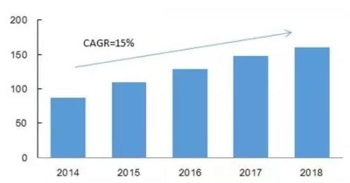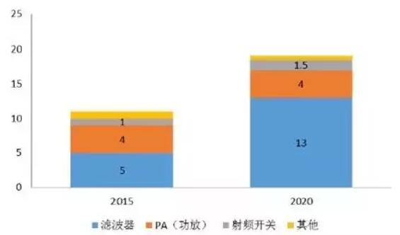 射頻前端模塊由功率放大器、濾波器、雙工器、射頻開關、低噪聲放大器、接收機/發射機等組成,隨著移動設備功能越來越強大,支持的網絡頻段越來越多,射頻前端模塊成了移動設備中不可缺少的一部分。2015 年,全球移動終端射頻器件市場規模約有110 億美金。根據高通半導體的預測,移動終端的射頻前端模塊在 2015-2020 年間的復合增速在 13%以上,到 2020 年市場規模將超過 180 億美金,而濾波器則是射頻前端模塊增長最快的細分方向,濾波器市場將由2015 年的50億美金增長到2020 年130 億美金。Mobile Experts 的預測與高通基本一致,2016年在智能手機增長萎靡(9%)的情況下,射頻前端模塊的增長率仍達到了17%,其中發展最快最關鍵的也正是濾波器模塊。