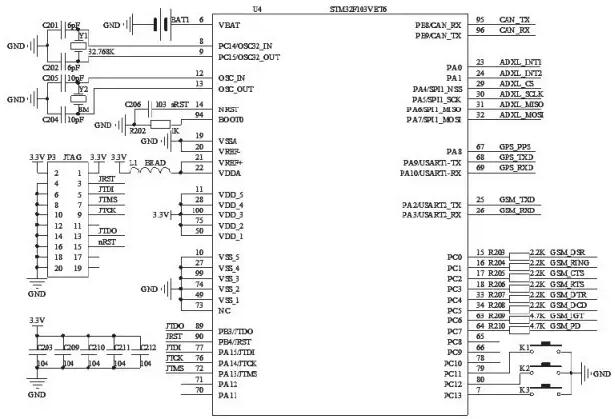 主控制器是整個防盜系統(tǒng)的核心,本文選用性能穩(wěn)定、功能強(qiáng)大的STM32F103系列單片機(jī)為主控制器,主控制器及外圍電路如圖1所示。